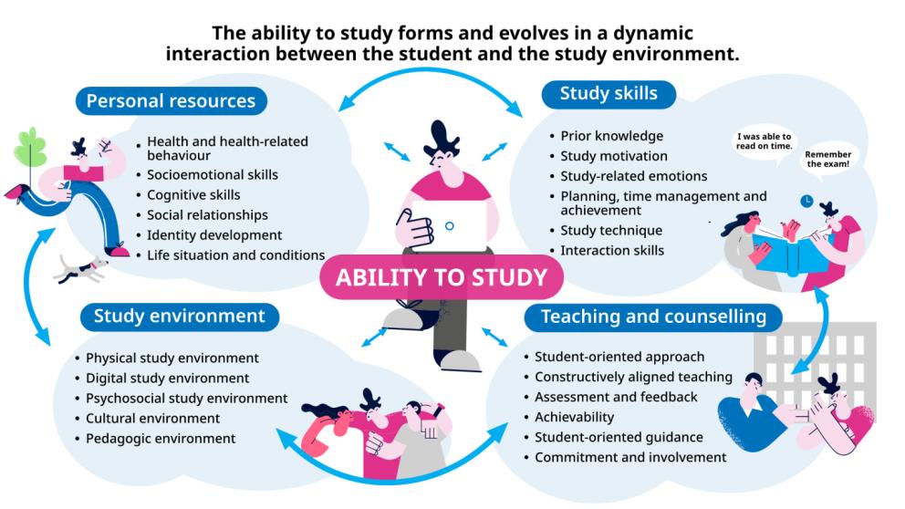 The guiding model for “ability to study”, developed by the Finnish Student Health Service (FSHS) and the Finnish Institute of Occupational Health, gets across various factors influencing students’ ability to do well – and provides guidance on how HE communities can promote it. The whole point is to integrate, not separate, healthcare with academic support – and stresses the importance of collaboration with and within universities.