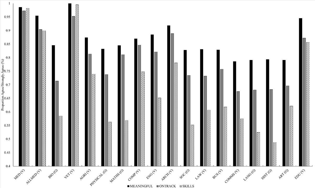 However, the results also challenge the narrative that generalist or academic degrees are inherently low value. As you can see, most subject areas—including history, languages, and the creative arts, often targeted in these debates—show strong subjective outcomes across the three dimensions. Only one field, history and philosophy, fell slightly below the 50 per cent threshold on the skills utilisation measure. But even here, graduates still reported relatively high levels of meaningful work and career alignment.