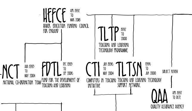 You can’t include everything, of course, even on a XXL tea towel. But the HEQC was the forerunner of the QAA, and much more enhancement focused. Subject Review was the QAA’s version of TQA, which was HEFCE’s baby. HEQC conducted institutional audits (rather than subject reviews) and emerged from the CVCP’s Academic Audit Unit in 1992 to counter the funding councils’ new roles.