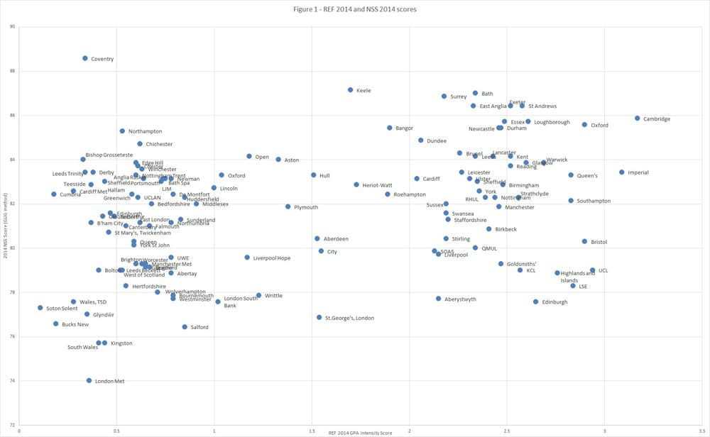 Figure 1 plots UK HEIs on a graph comparing their REF 2014 GPA score, weighted for intensity, and their NSS 2014 results by the Times Good University Guide (GUG) method (an un-weighted average of the 7 ‘banks’ of questions). Unsurprisingly, there is a tendency for higher NSS scores to mirror higher REF scores, with the most prestigious research universities tending to attract tending to attract the most successful students and staff, as well as being better endowed with funding and facilities for high-end teaching and research.