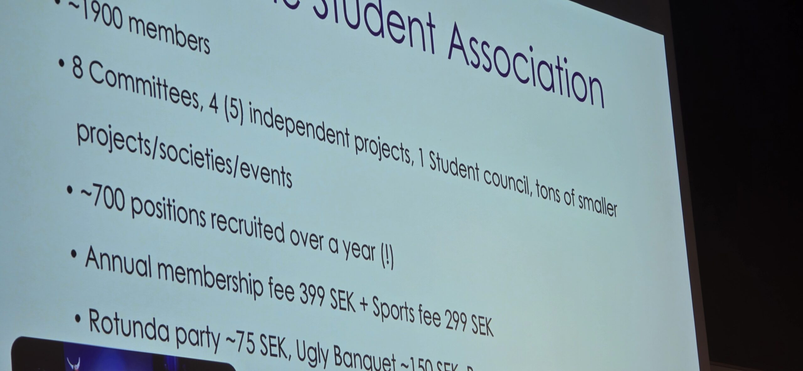 At Stockholm’s School of Economics, the student association’s VP for Education told us that of the circa 1800 students enrolled, about 96 per cent are SU members – and 700 of them are “active”. I think I thought he meant “pitching up to stuff semi-regularly”, but on the next slide he meant ”have a position of responsibility”.