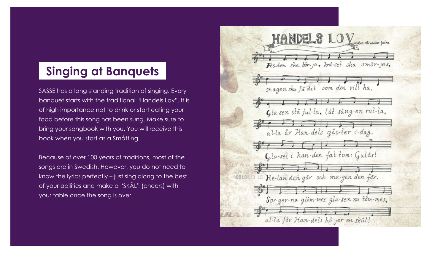 It came up in both an academic context and a social context. In the former, the focus was on independent study and the relative lack of contact hours in the Swedish system – in the latter, through traditions like “spex” (comedic part-improv theatrical performances created and performed by students), students wearing boiler suits with patches, or “Gasques”, where where students dress up, sing traditional songs, and enjoy multiple courses of food alongside speeches and entertainment.