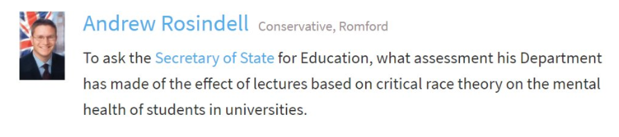 What’s worse? An actual MP that actually thinks that “lectures based on critical race theory” are responsible for the student mental health crisis, or one that knows that’s nonsense but stokes the culture war up anyway?