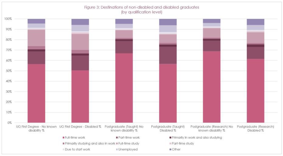 So what are the key findings of this study? Firstly, compared to non-disabled graduates, at all qualification levels those disclosing a disability were less likely to be in full-time employment, more likely to be in part-time employment and more likely to pursue further study. These poorer progression rates into full-time employment for disabled graduates are a recurring theme in What Happens Next? reports. However, there was a general increase in total employment figures (full and part-time employment combined) for disabled graduates with increasing qualification level.