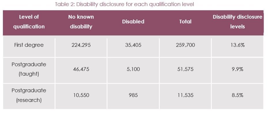 Using data acquired by HEFCE for the DHLE survey carried out on individuals graduating in 2016 in the UK, this most recent study reports on the disclosure of disability and destinations of this cohort of graduates. There has been a year-on-year increase in the proportion of graduates disclosing a disability at all qualification levels for the past three years and this trend is in line with the increase in disabled students entering higher education in recent years. Continuing the pattern of the past two What Happens Next? reports, disclosure decreased with increasing qualification level.