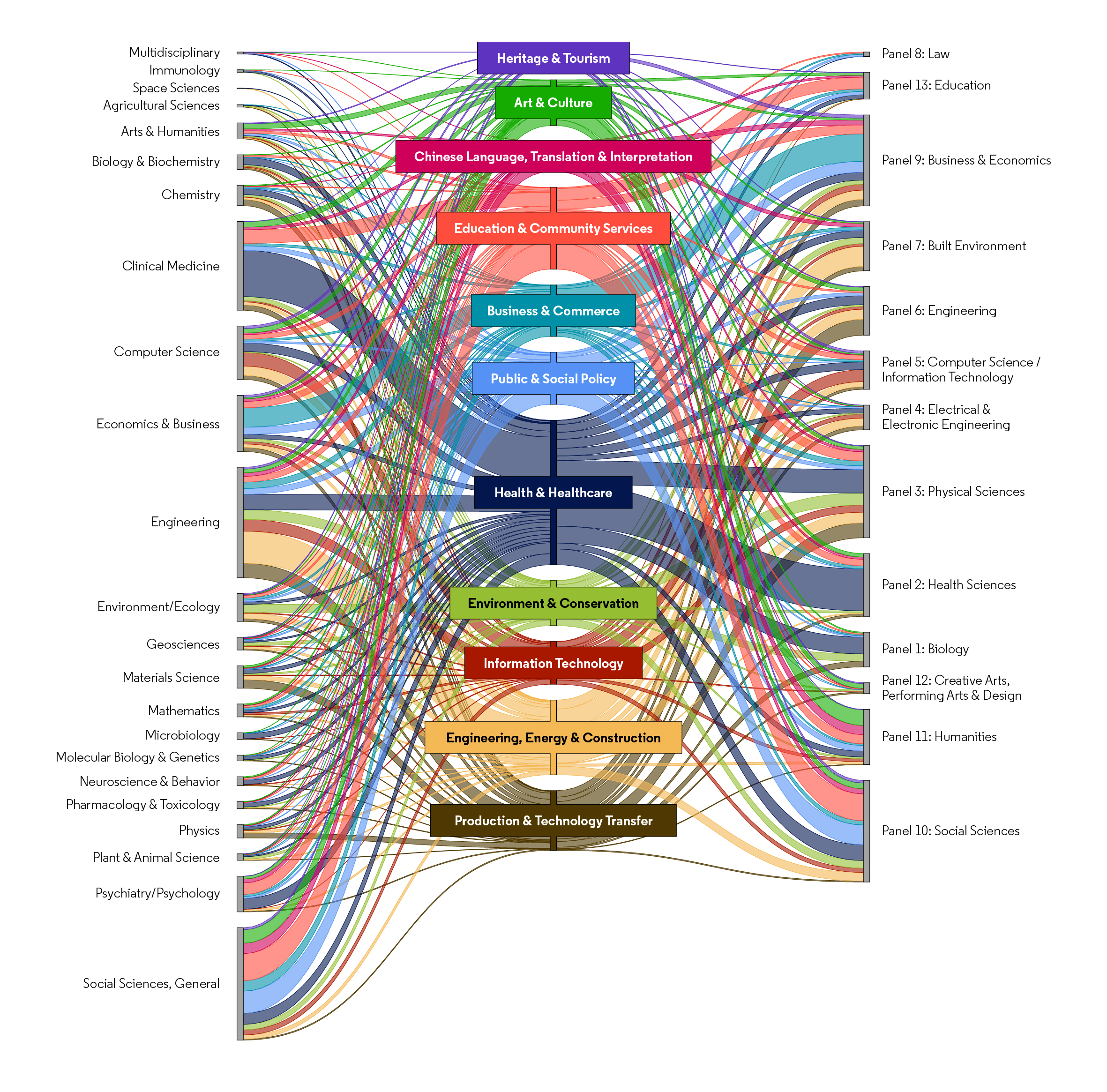 The pathways to impact, illustrated in the alluvial diagram, demonstrated the multidisciplinary nature of research impact. On the left we trace pathways between research disciplines of underpinning papers and the eleven impact topic clusters and on the right, between topic clusters and the Hong Kong RAE subject panels. The colour bands are determined by the topic clusters. The multiple lines leading into the eleven topic clusters in the middle, illustrate the multidisciplinary nature of the underpinning research, whether organised by research discipline (left hand side) or submitting panel (right hand side).