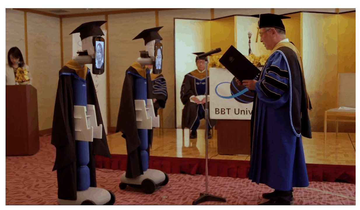 Most students at Tokyo’s Business Breakthrough University could not physically attend their graduation ceremony this March, but a lucky few were selected to collect their diplomas the, uh, old-fashioned way, via cap-and-gown-draped robots with tablets for faces.