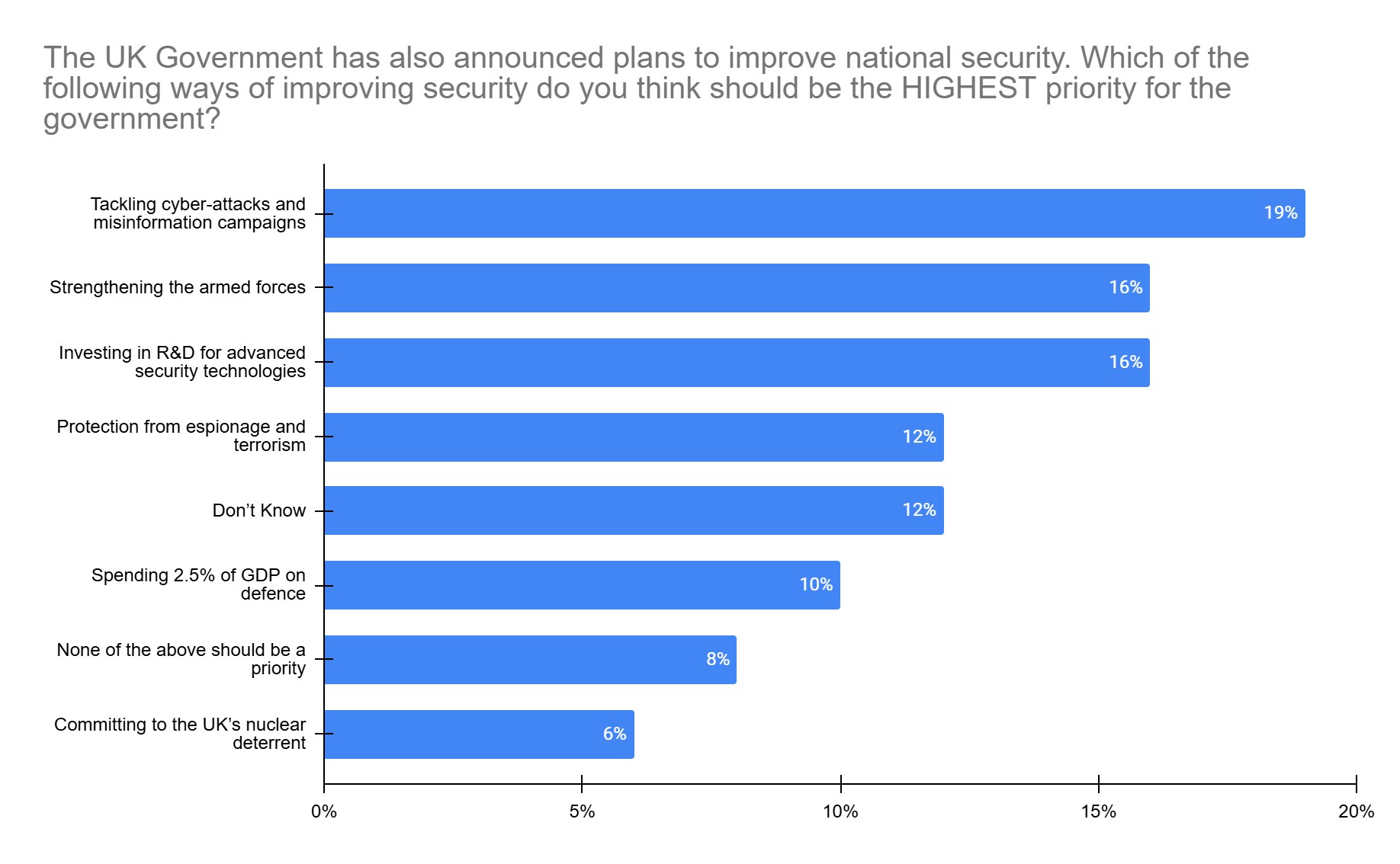 When we asked what the highest priority should be to improve national security, investment in R&D was the joint second most popular option, behind tackling cyber attacks and misinformation.