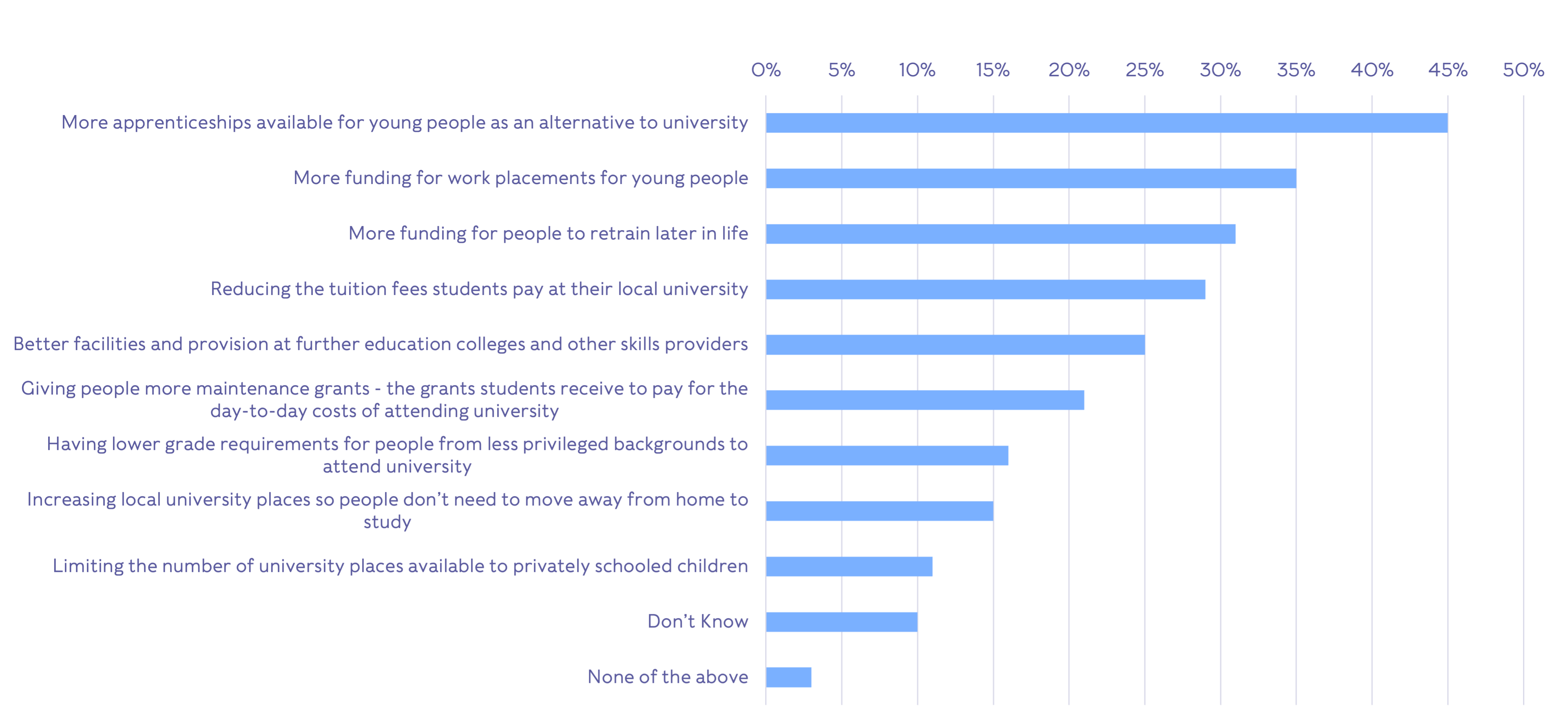 We asked 2,000 members of the public to pick from a number of policy options for how universities and training might be used to “level up” local areas, and to select the three they most support. These were the results: