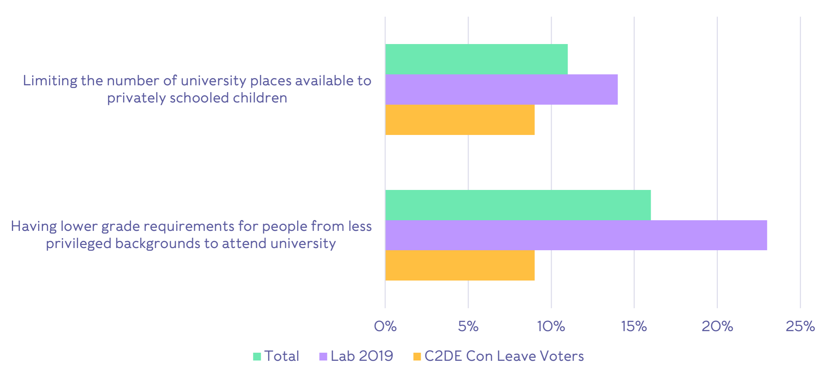 Our colleague Ed Dorrell has already picked out what this tells us about support for apprenticeships. But we also want to focus on how far down the priority list the two proposals are that relate specifically to university admissions: lower entry requirements for those from disadvantaged backgrounds, and limiting the number of places available to private schools. Only 16 per cent and 11 per cent respectively of the public included these options in their top three.