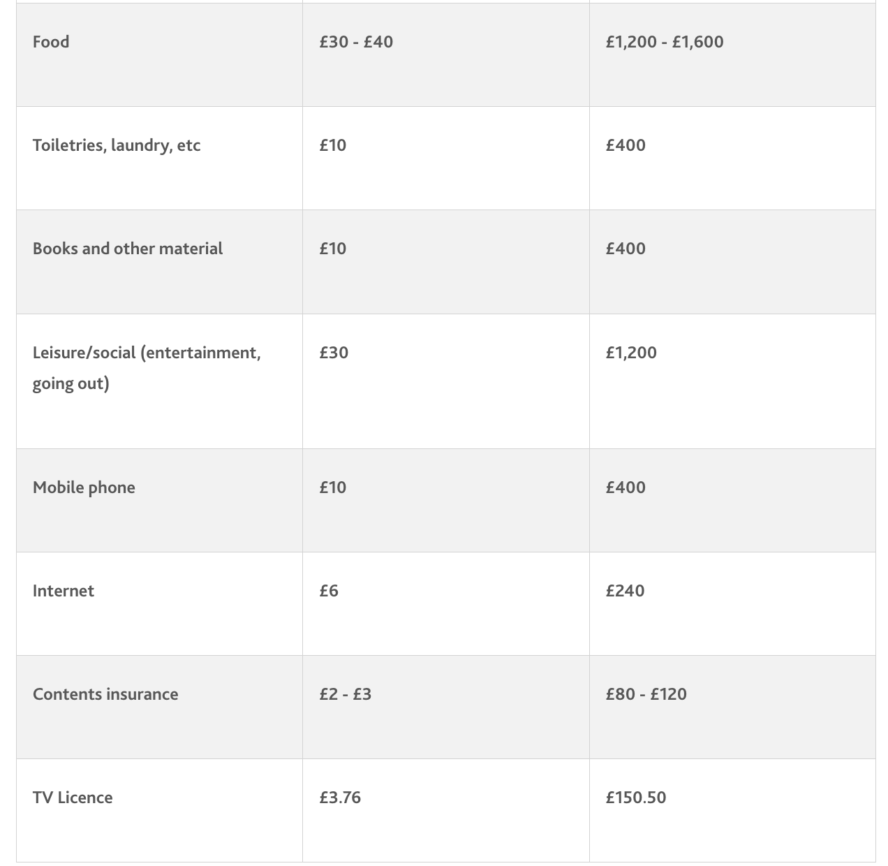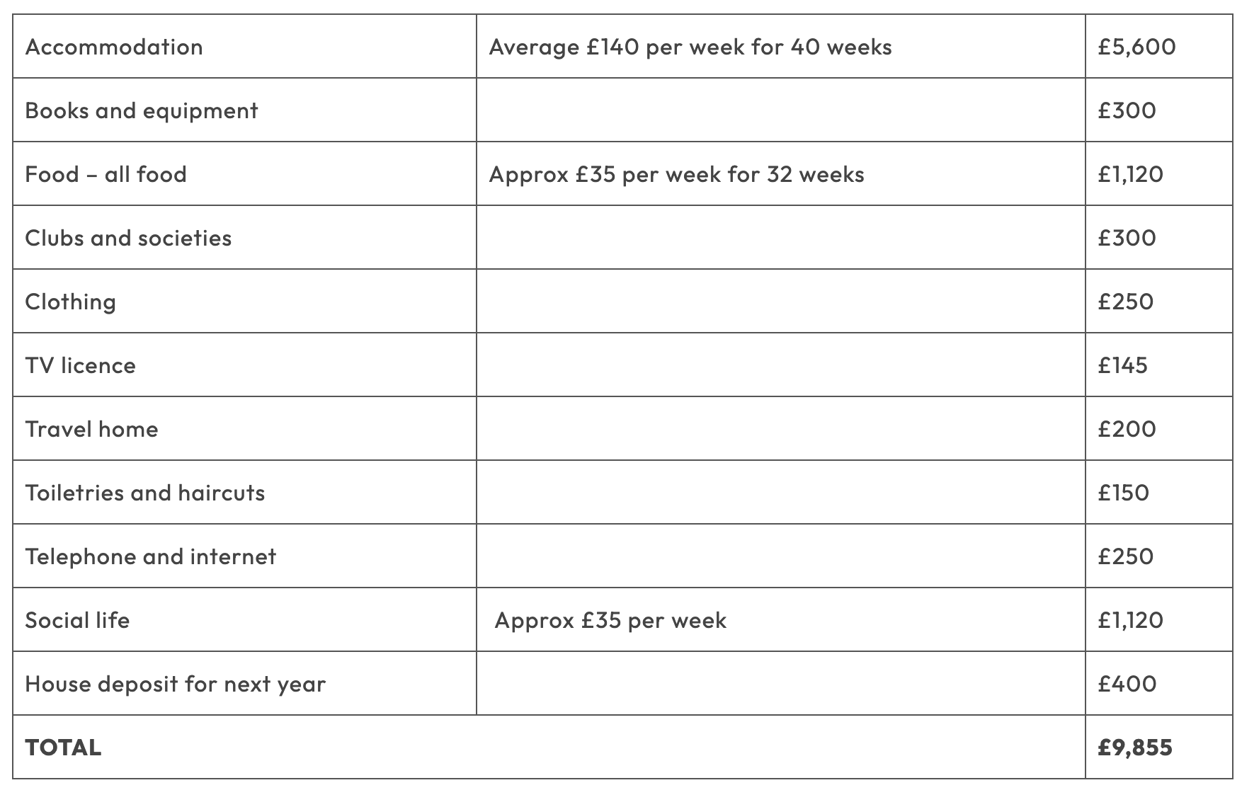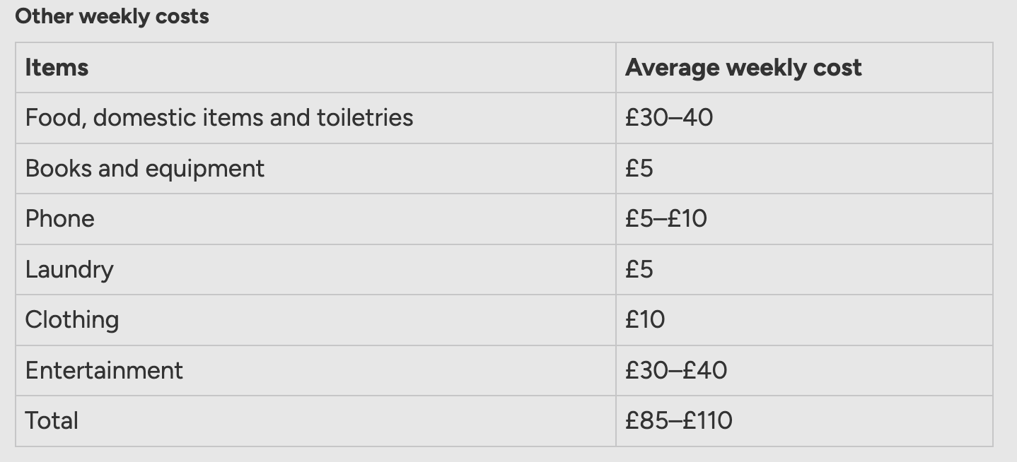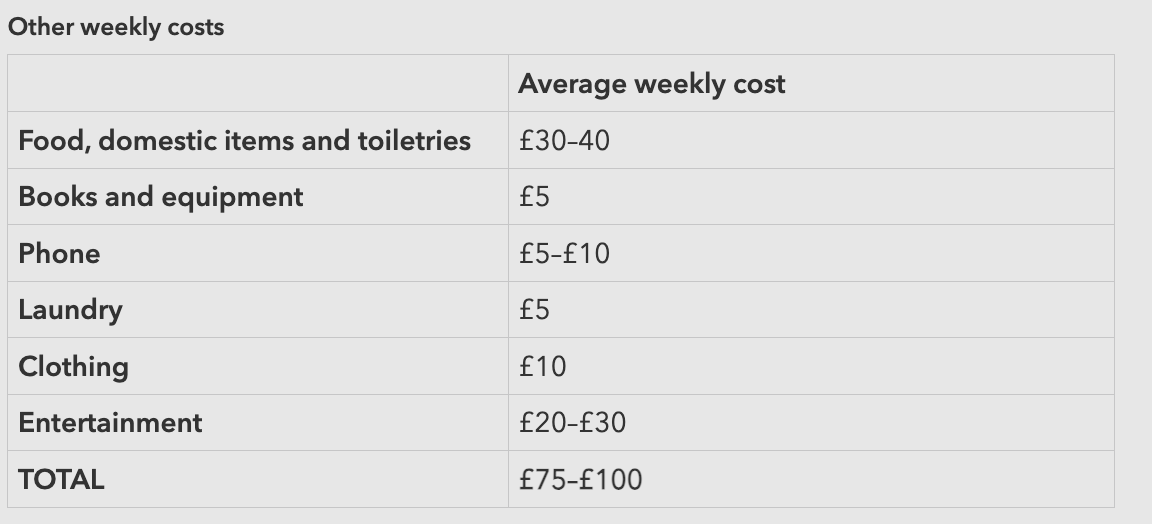 We begin at a university in the North West, where students are told that it is important to “budget their money carefully”, with this handy table of “examples that demonstrate current living costs per month”: