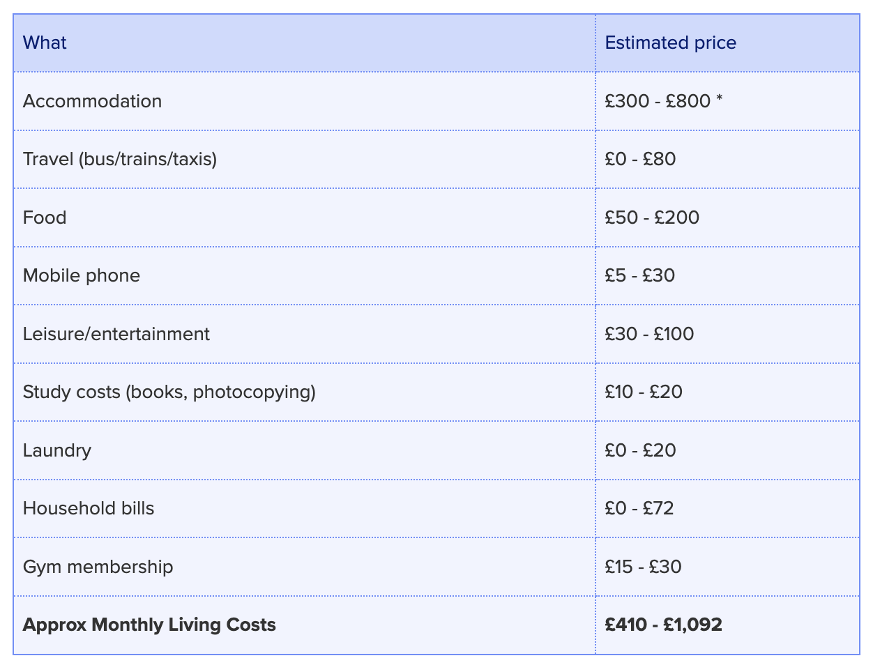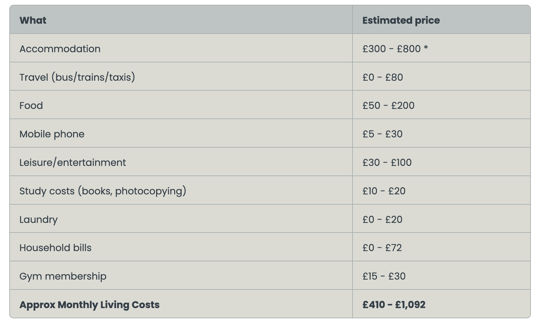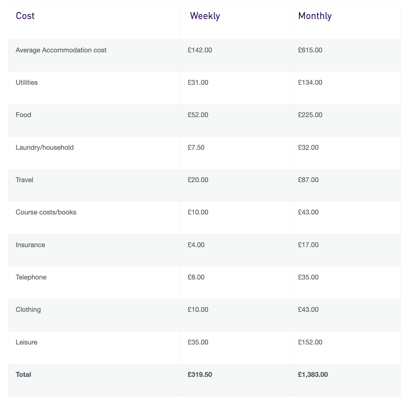 We begin at a university in the North West, where students are told that it is important to “budget their money carefully”, with this handy table of “examples that demonstrate current living costs per month”:
