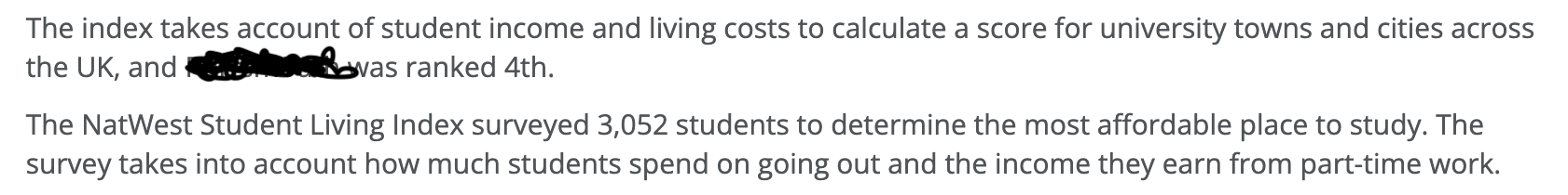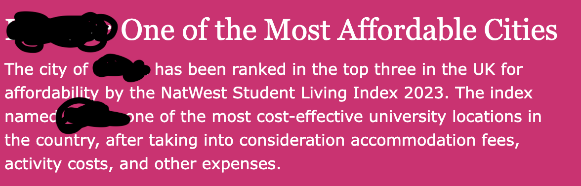 And some universities brag about their position in whatever league table is around on cost of living. These both trumpet their places in the NatWest Student Living Index – the exercise that in 2021 told us that students in London were paying £9.10 a pint, in 2022 suggested student rents in Edinburgh had fallen to £200 a month, and last year claimed that the average number of hours students were spending in part time work each month had decreased from 43.16 to 18.3.