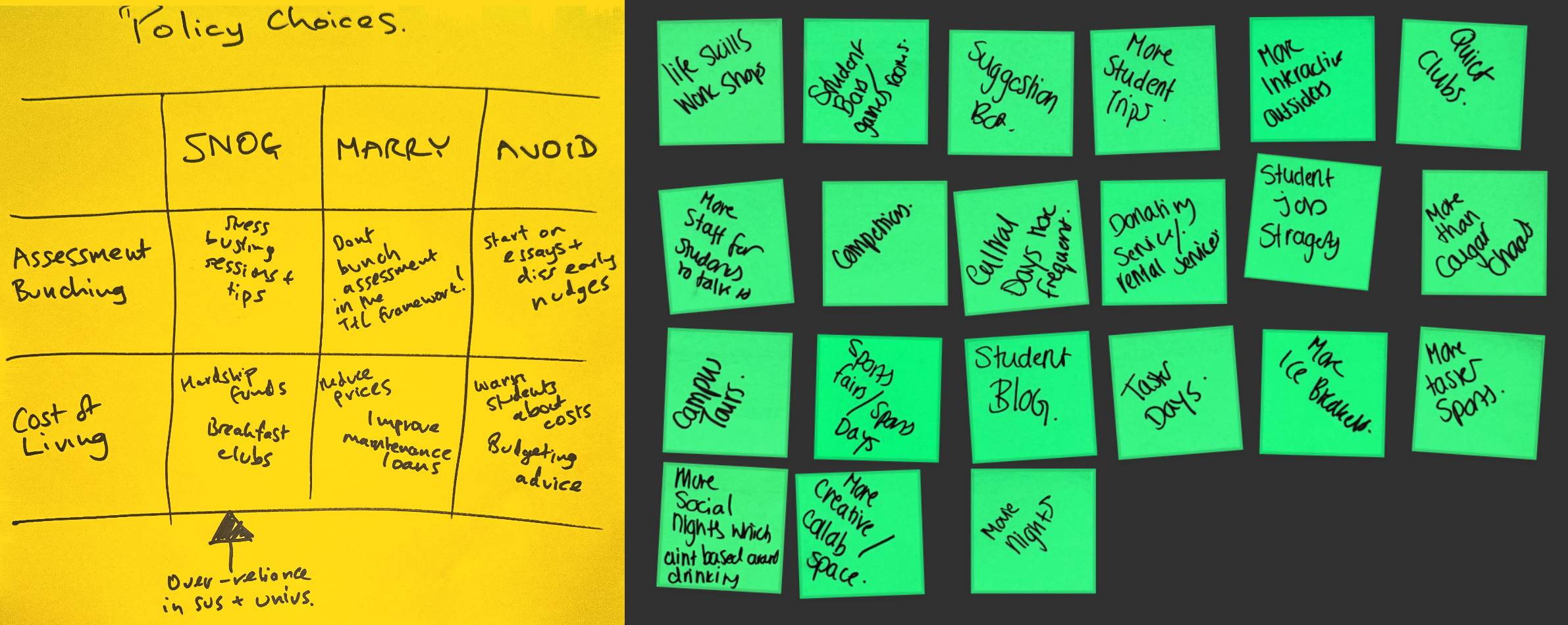 So if students’ deadlines are all bunched up, the SU could “snog” with assessment period coping classes or chillout rooms, “marry” them by lobbying to get assessments spread out, or “avoid” by somehow causing students to not leave writing their dissertation until the last minute (or even choosing modules, universities or courses where that sort of bunching isn’t present).