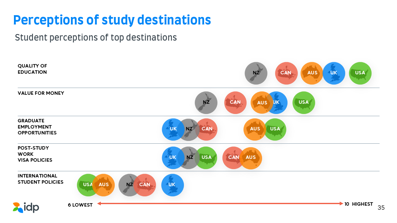 Emerging Futures captures student perceptions about important factors including “quality of education”, “value for money”, “graduate employment opportunities”, “post-study work visa policies” and “international student policies”. In this latest study, USA and UK continue to be the front-runners in student minds for the first two categories’ but these perceptions are declining. Alarmingly, perceptions of the UK are lowest in two key factors: “graduate employment opportunities” and “post-study work visa policies” .