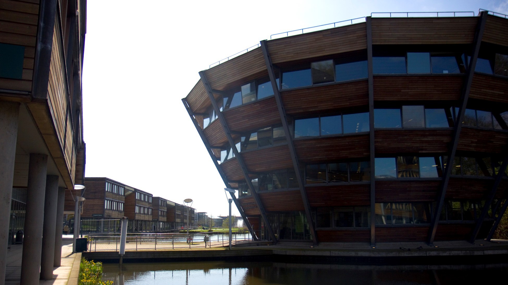 The university has won awards for its sustainable development of this brownfield site, with lakes, green roofs, and hi-tech building features (including biomass boilers, passive ventilation, lighting sensors, heat recovery systems, and even more solar panels).
