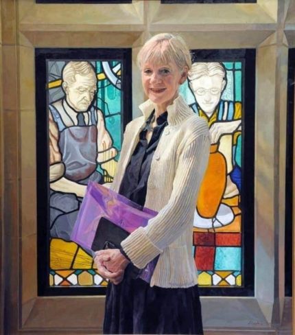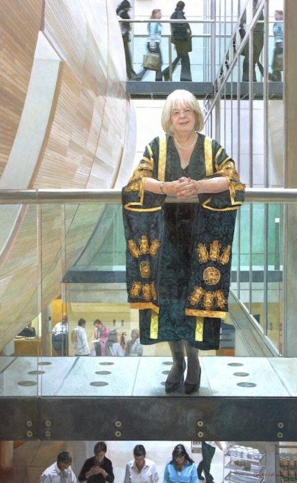 Another good way to see the work of current portrait painters is through the Royal Society of Portrait Painters. Here you can find other representations of recent vice chancellors, often now depicted with buildings behind them. Shirley Pearce appears in front of two stained glass windows at Loughborough, Colin Campbell stands in front of the construction of the Jubilee Campus at Nottingham, and Sandra Burslem is on a glass bridge at Manchester Metropolitan, (all three painted by Alasdair Adams).