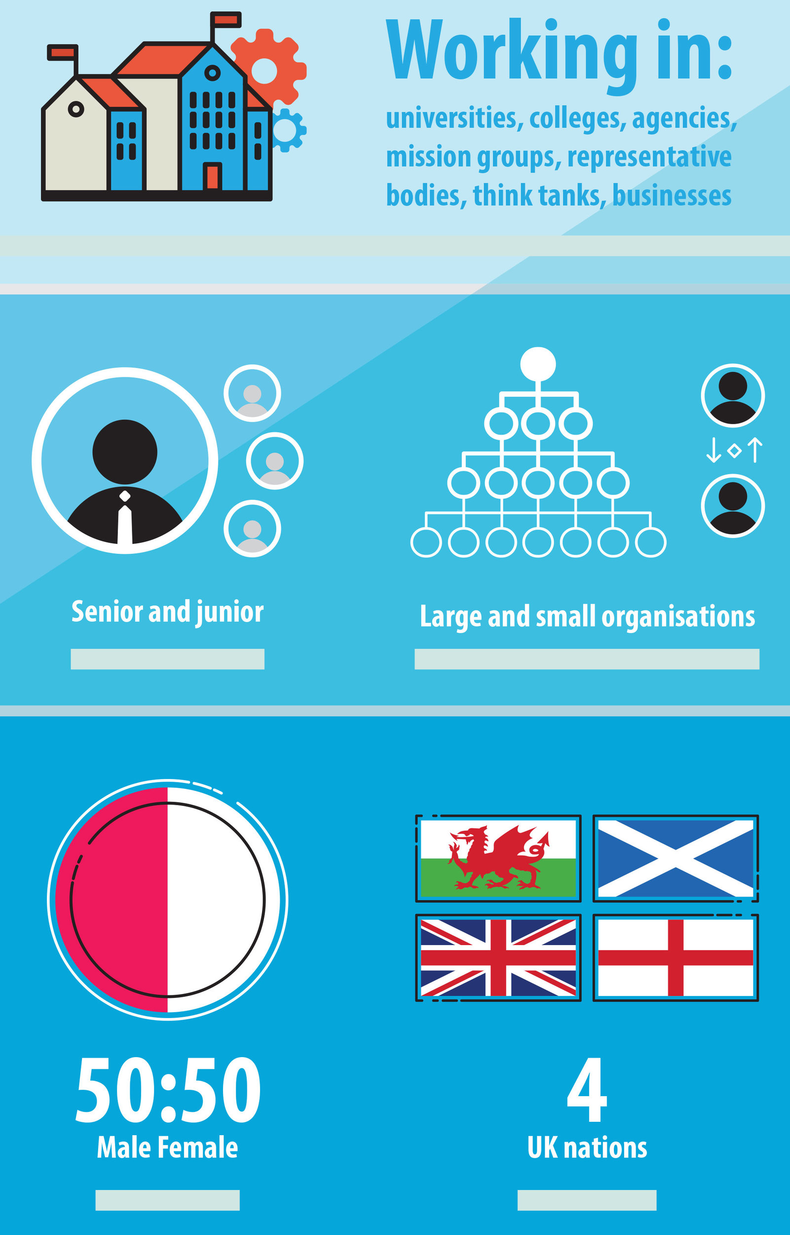 There is no standard definition of a wonk in higher education. It’s not a job title or a position, so we have developed our own panel that represents a range of different viewpoints, backgrounds and levels of seniority. Below shows how we compiled the panel: