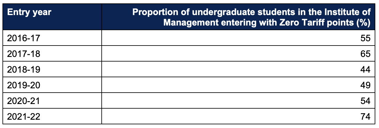 On that it noted, for example, that the proportion of undergraduate students joining the Institute of Management with a “Zero Tariff” entry profile has, in four of the last six years, been a majority of the student intake: