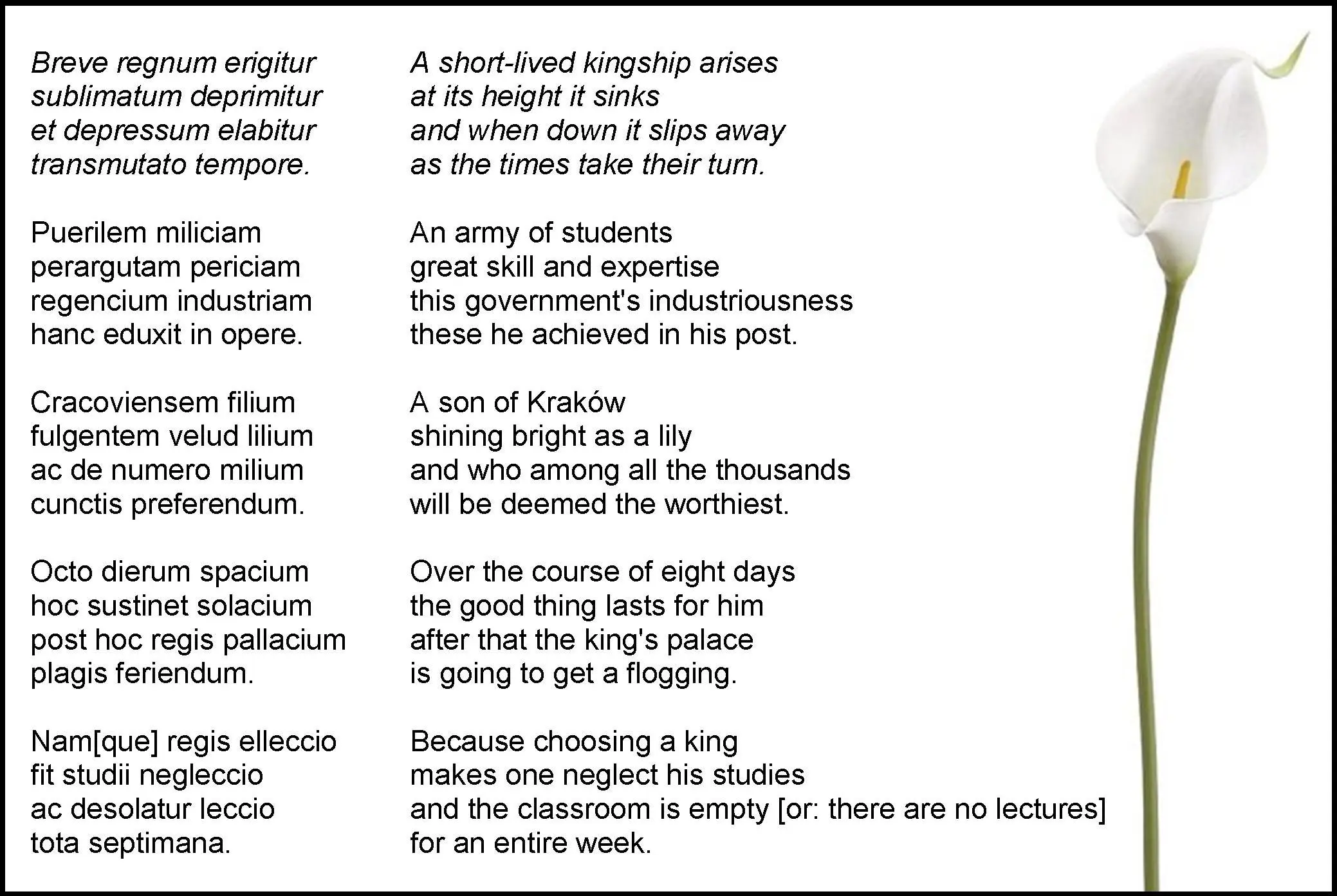 Breve regnum erigitur is a song from the mid-15th century, sung by students in Kraków during their annual week of student rule, where there was a reversal of hierarchy – students elected their own “king”, took over the university and abolished lectures.