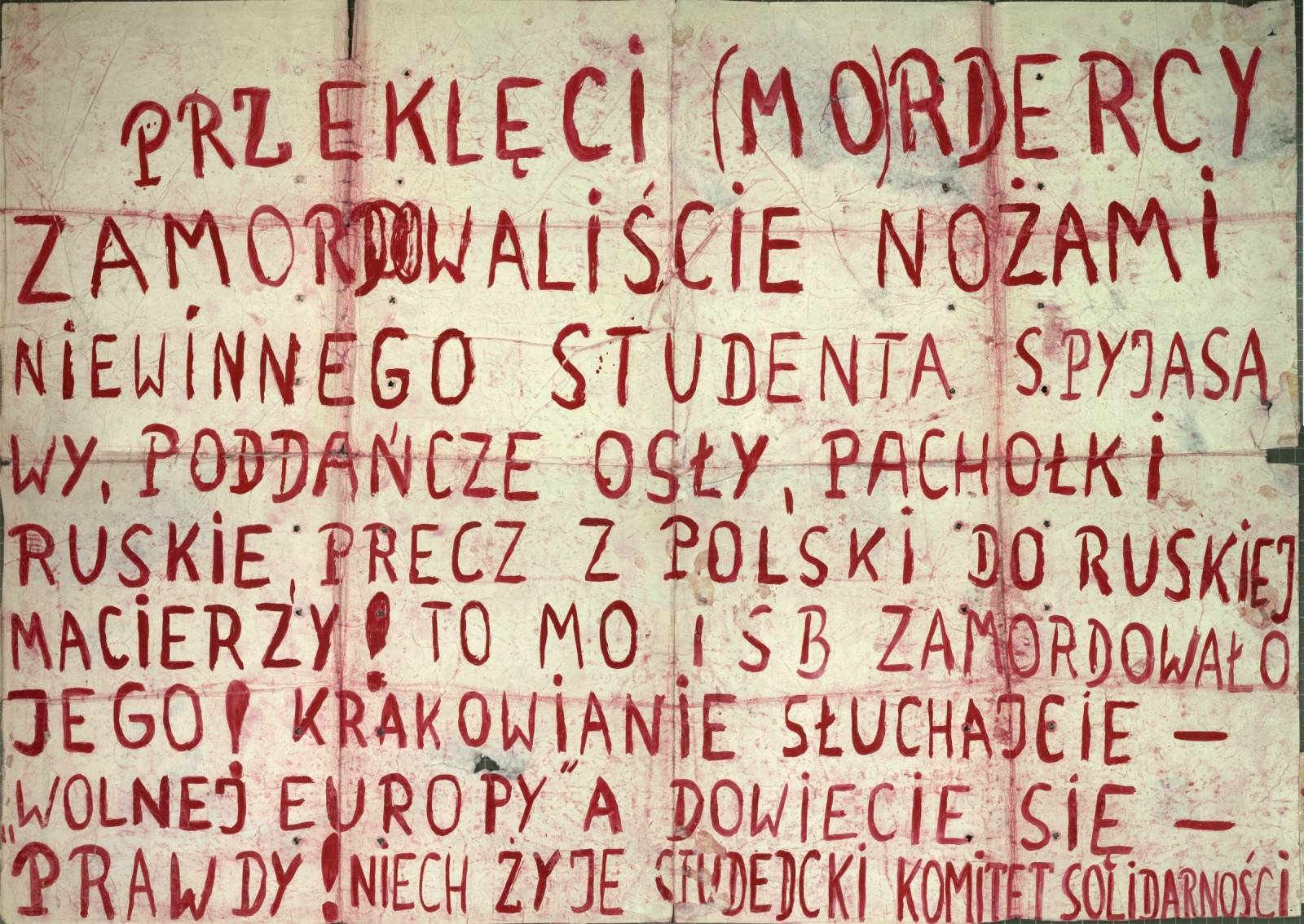 CURSED (MURDERERS) You murdered the innocent student S. Pyjas with knives. You submissive donkeys, Russian lackeys – out of Poland, back to your Russian motherland! It was the SB (Security Service) that murdered him! Cracovians, listen to “Radio Free Europe” and learn the truth! Long live the Student Solidarity Committee!