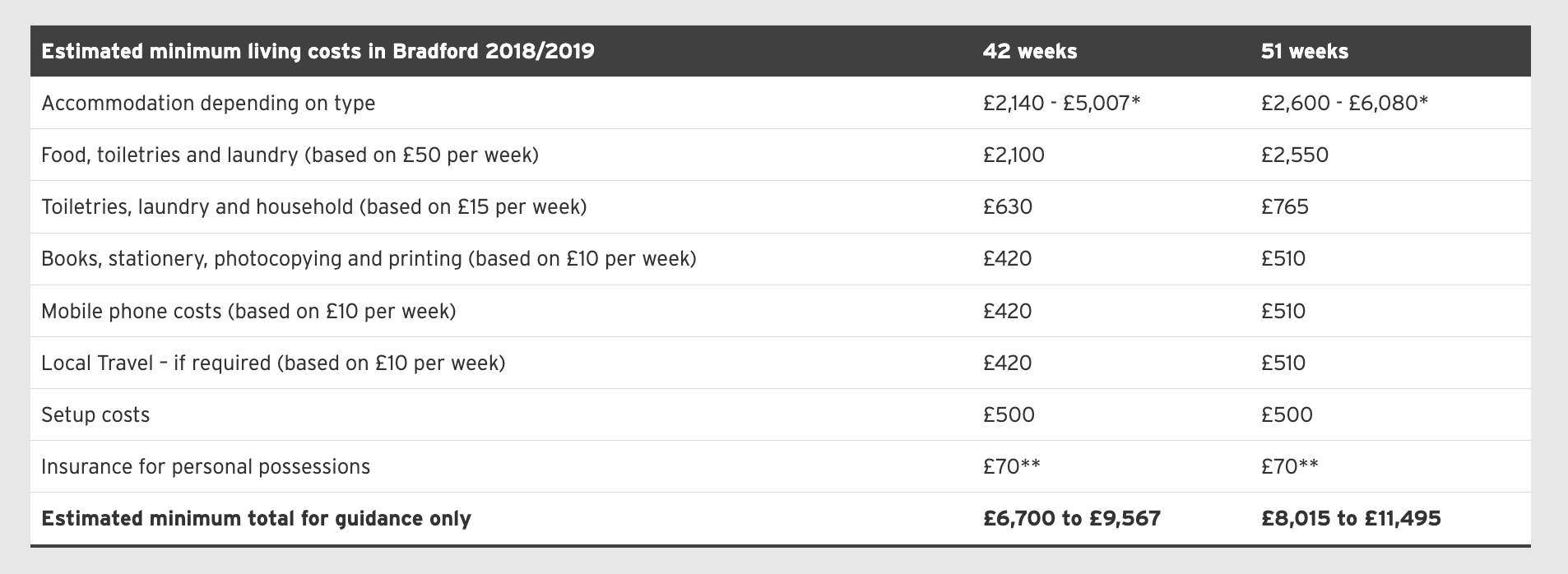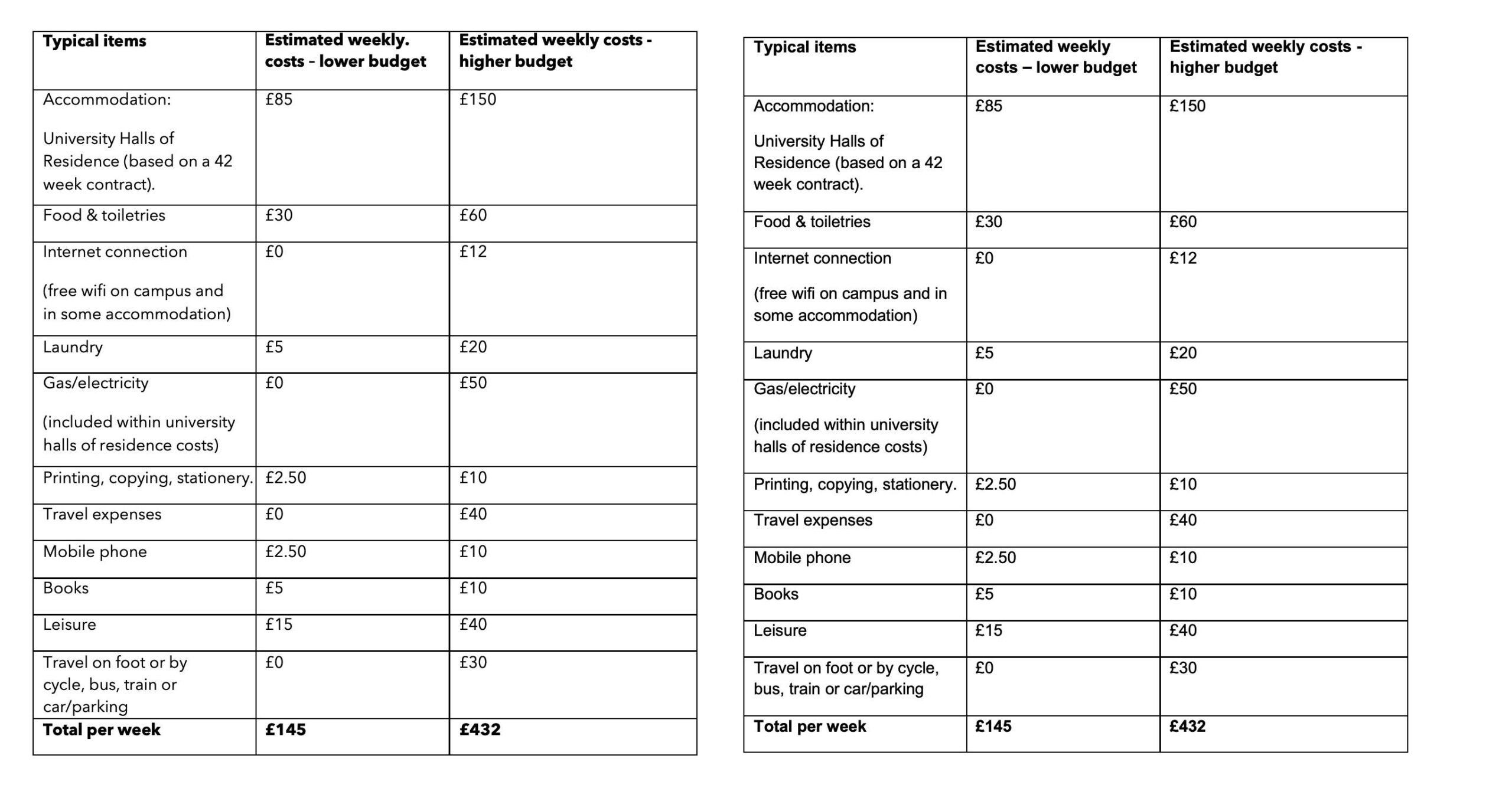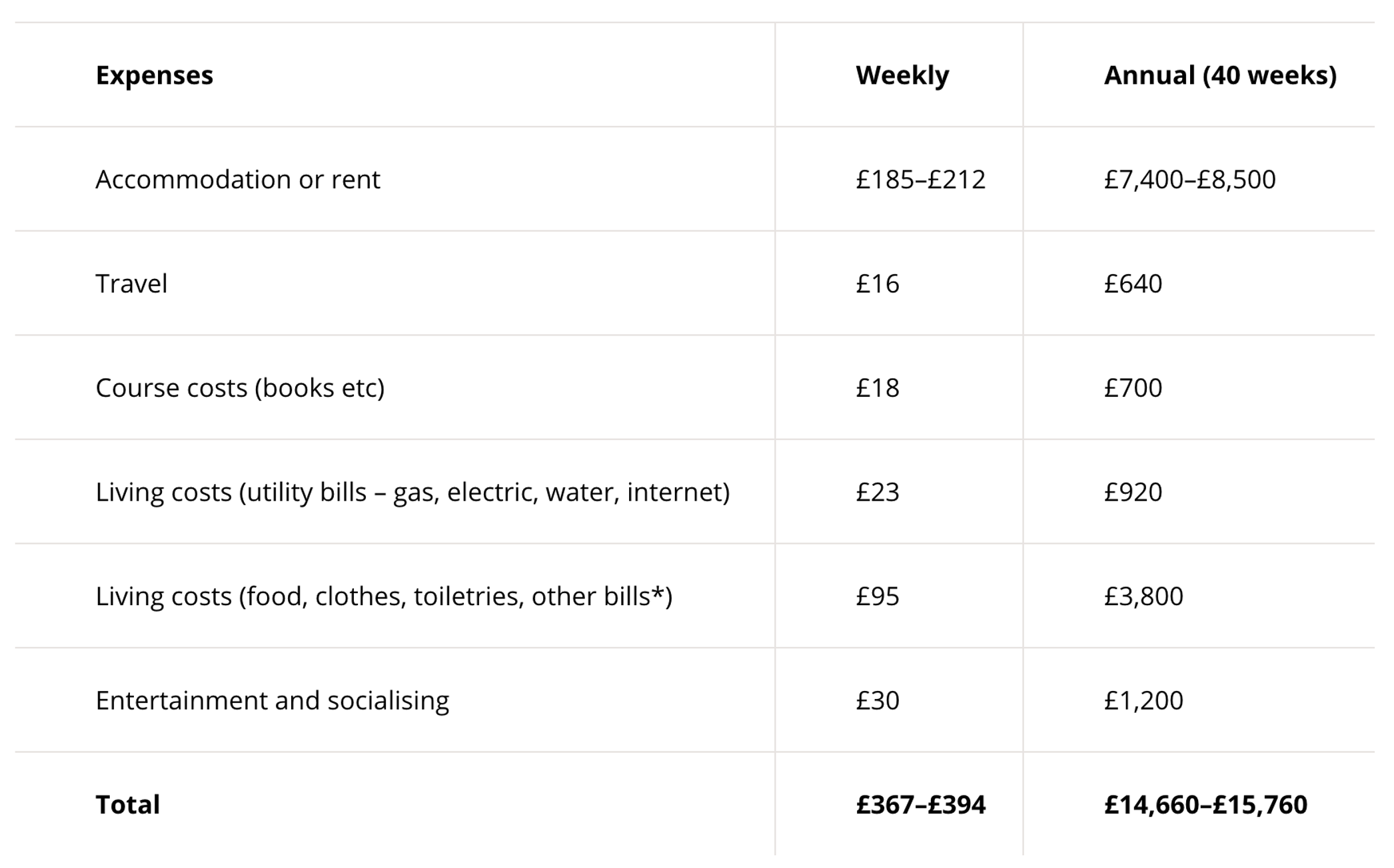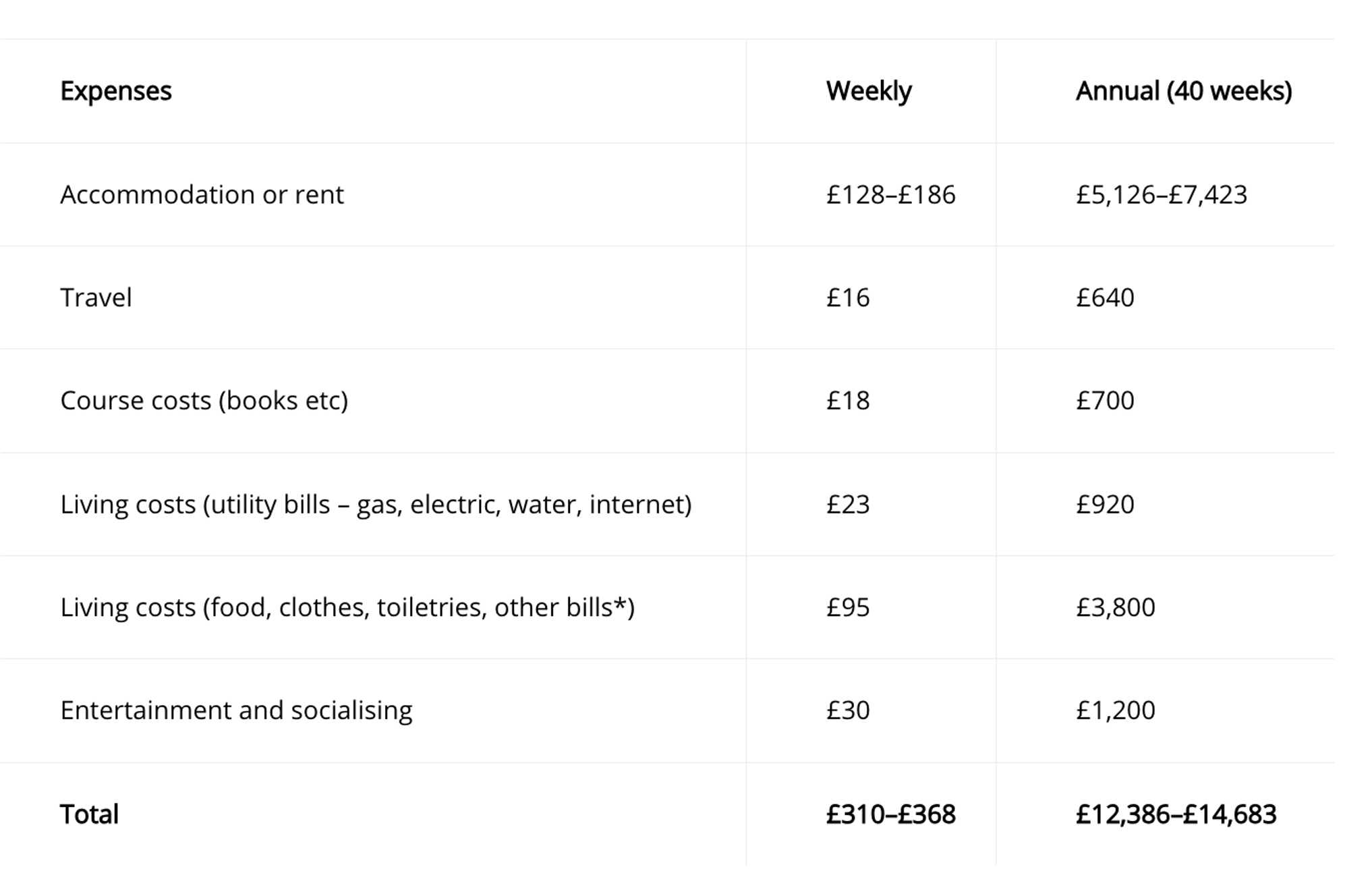 Sometimes, a picture is painted of painstaking research carried out by dedicated money advisors. Here’s a table that says the minimum costs have been estimated by the university’s support teams: