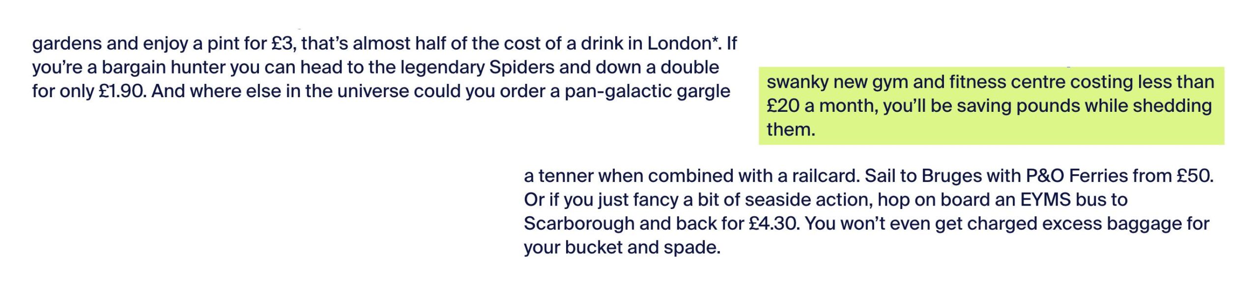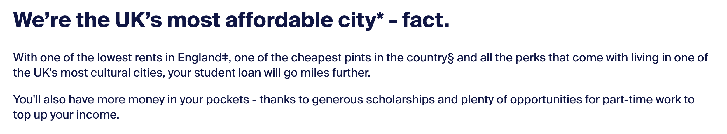 Campus gym prices are listed as less than £20 a month (it’s actually from £22.95 for students), rent for a one-bed city flat is listed as £572 (the source actually says £623.57), and you’re even told that you can head to a “legendary” local nightclub to “down a double” for £1.90.