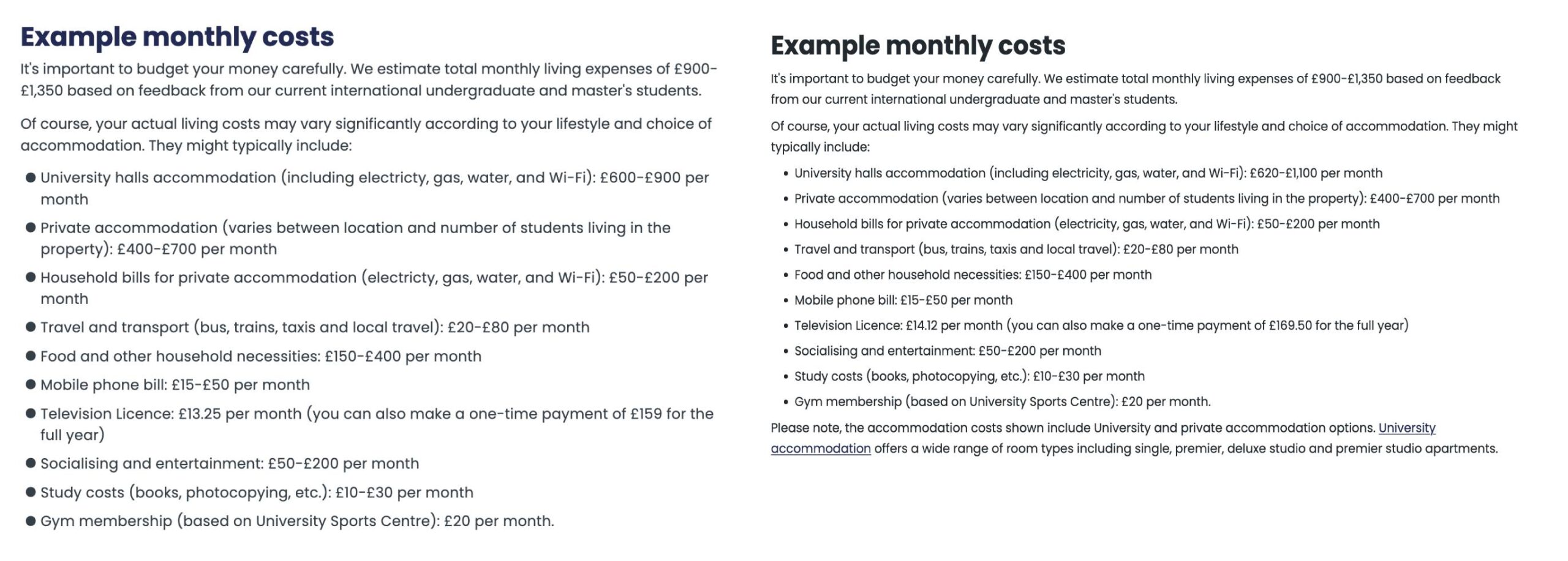 Sometimes you find things like this, a set of costs “based on feedback from our current international undergraduate and master’s students”. Someone has gone in and updated the costs for university halls – but hasn’t updated anything else, and nor have they updated the estimate for total monthly living expenses: