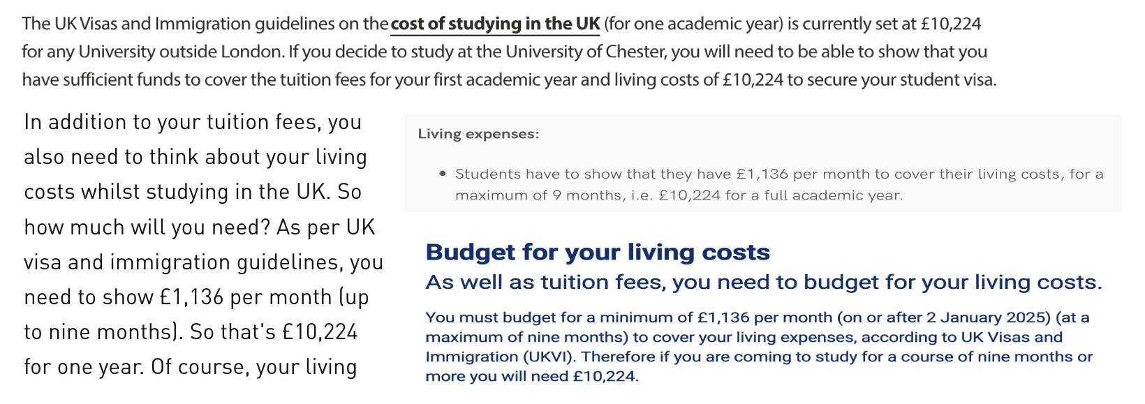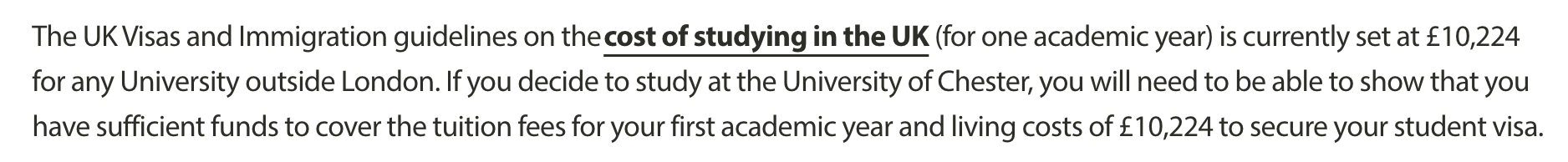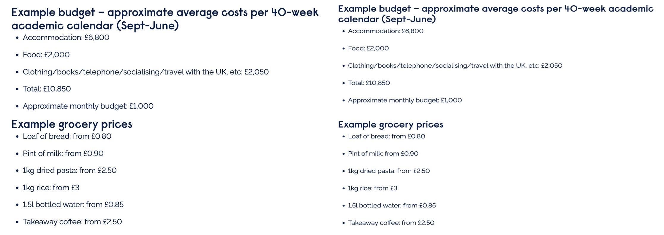 Plenty of universities don’t list costs at all, but imply to international students that the “proof of funds” figure has been calculated by Home Office officials as enough to live on: