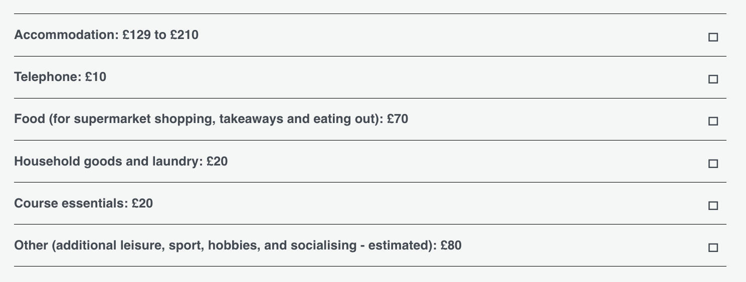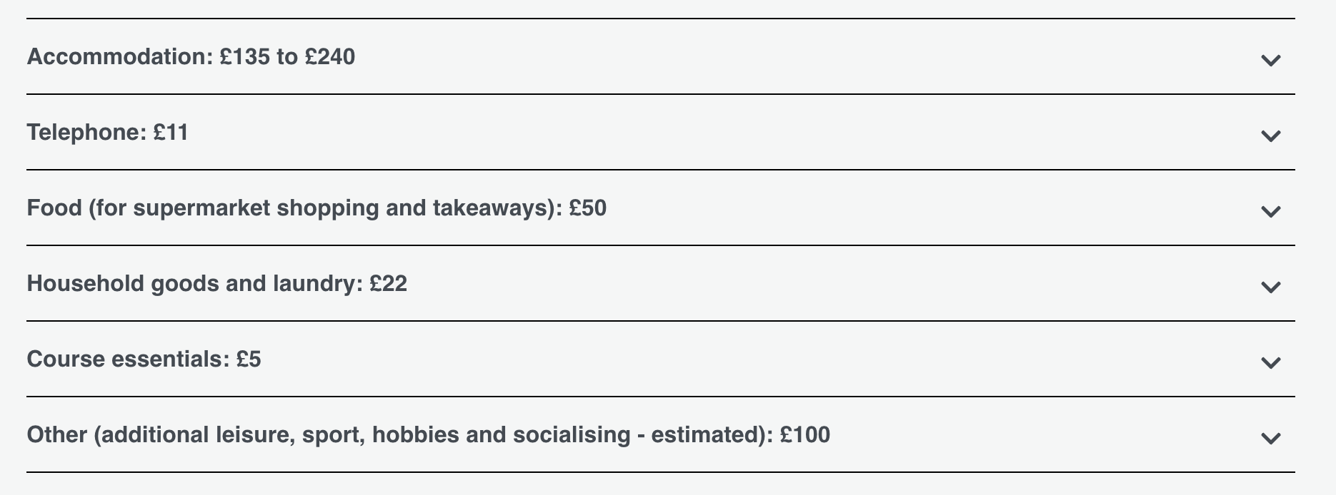 Not every university has a run at listing costs. Many (over 30 at the time of typing) refer their readers to the Which? Student Budget Calculator.