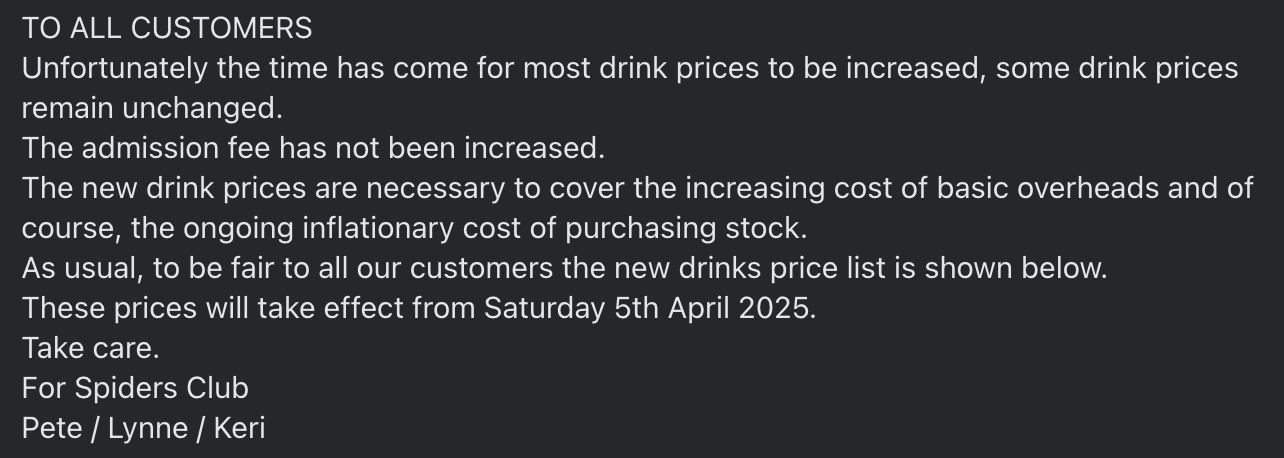 Sadly, even Spiders Nightclub is having to cover “the increasing cost of basic overheads” and “the ongoing inflationary cost of purchasing stock”. The current price is £2.50.