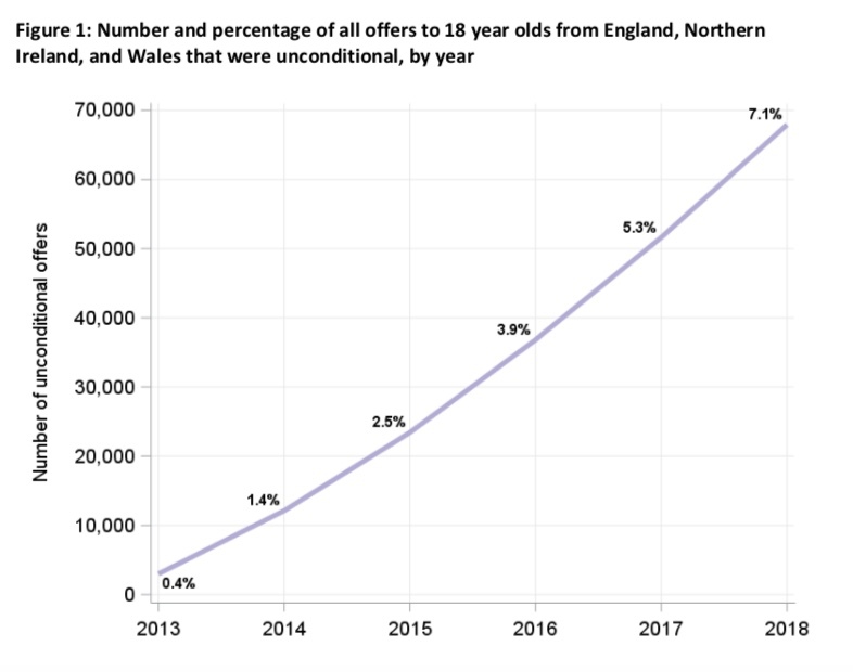 There has been some rather extreme reaction to the growth in unconditional offers recently, not least because of a fear that they are encouraging students to ‘coast’, knowing they have the place in the bag, and therefore resulting in underperformance and poor preparation for university level study. See this recent Guardian report for example.