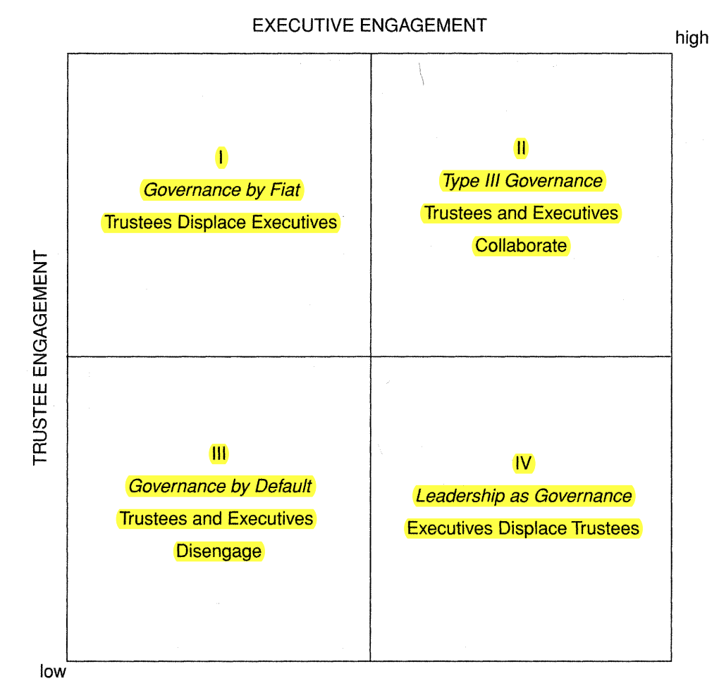 As a result, some of the board’s potential to add value goes untapped, despite the trustees’ familiarity with the mode. However, there may be an even steeper price to pay if boards overlook or underperform Type III work because, unlike Types I and II where there are moments for leadership, the generative mode is about leadership. It is the most fertile soil for boards to flower as a source of leadership.