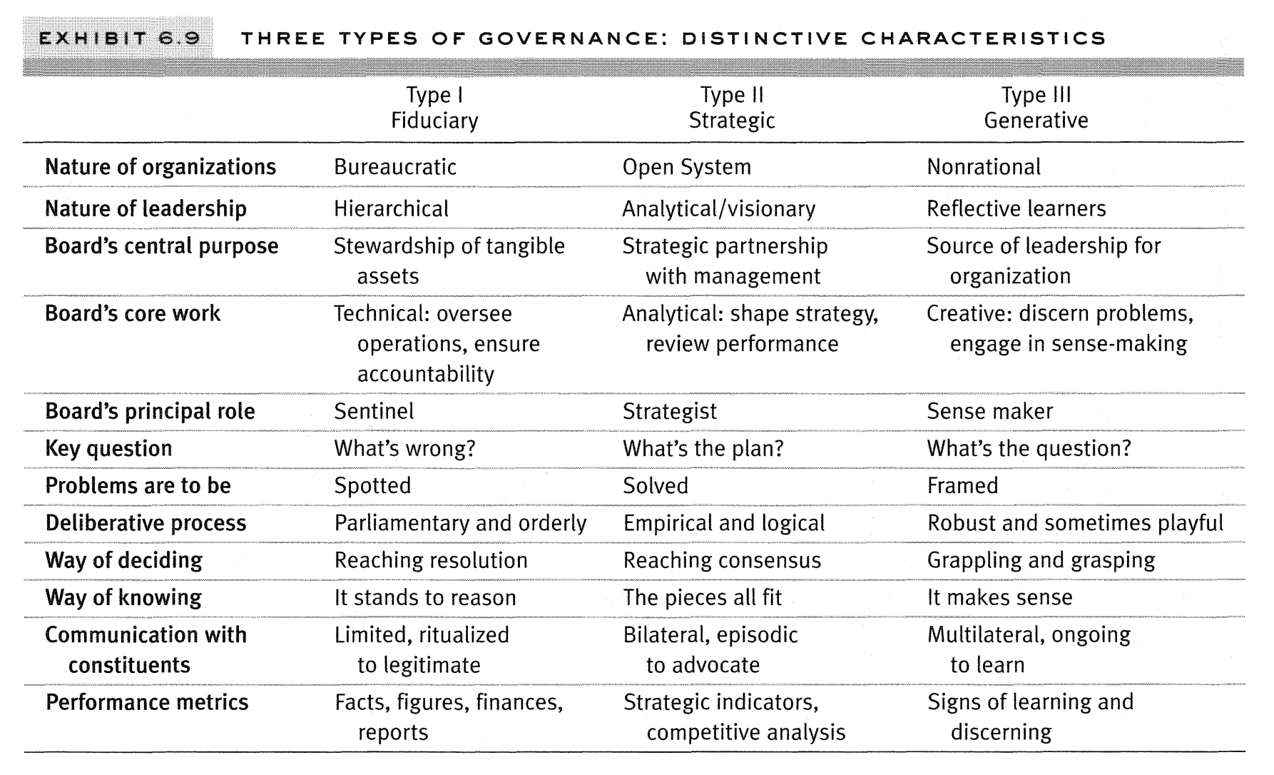 One of my favourite bits of academic work on this comes from a 2004 book called Governance as Leadership: Reframing the Work of Nonprofit Boards. Informed by theories that the authors argue have transformed the practice of organisational leadership, it takes the traditional fiduciary and strategic focus of a board and introduces a third dimension of effective trusteeship – generative governance.