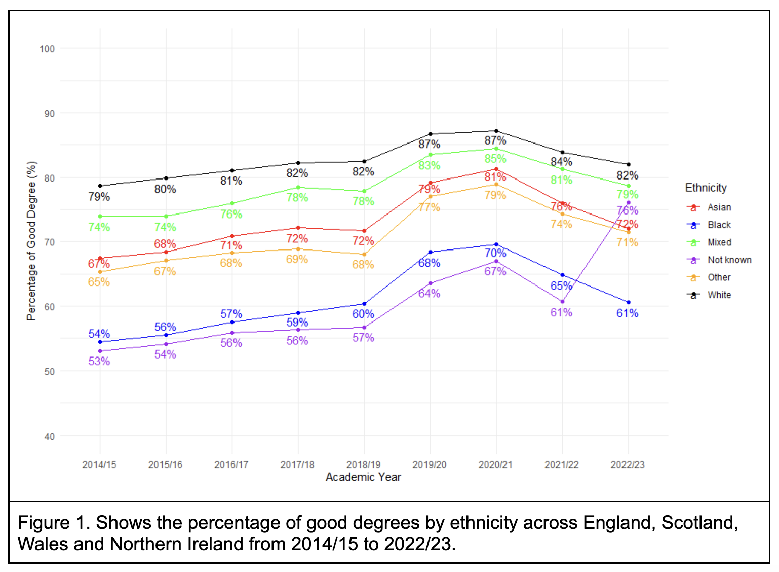 Let’s take a moment to imagine the following scenario – 74 per cent of white students get good degrees while 60 per cent of black students get good degrees, giving an awarding gap of 14 per cent.