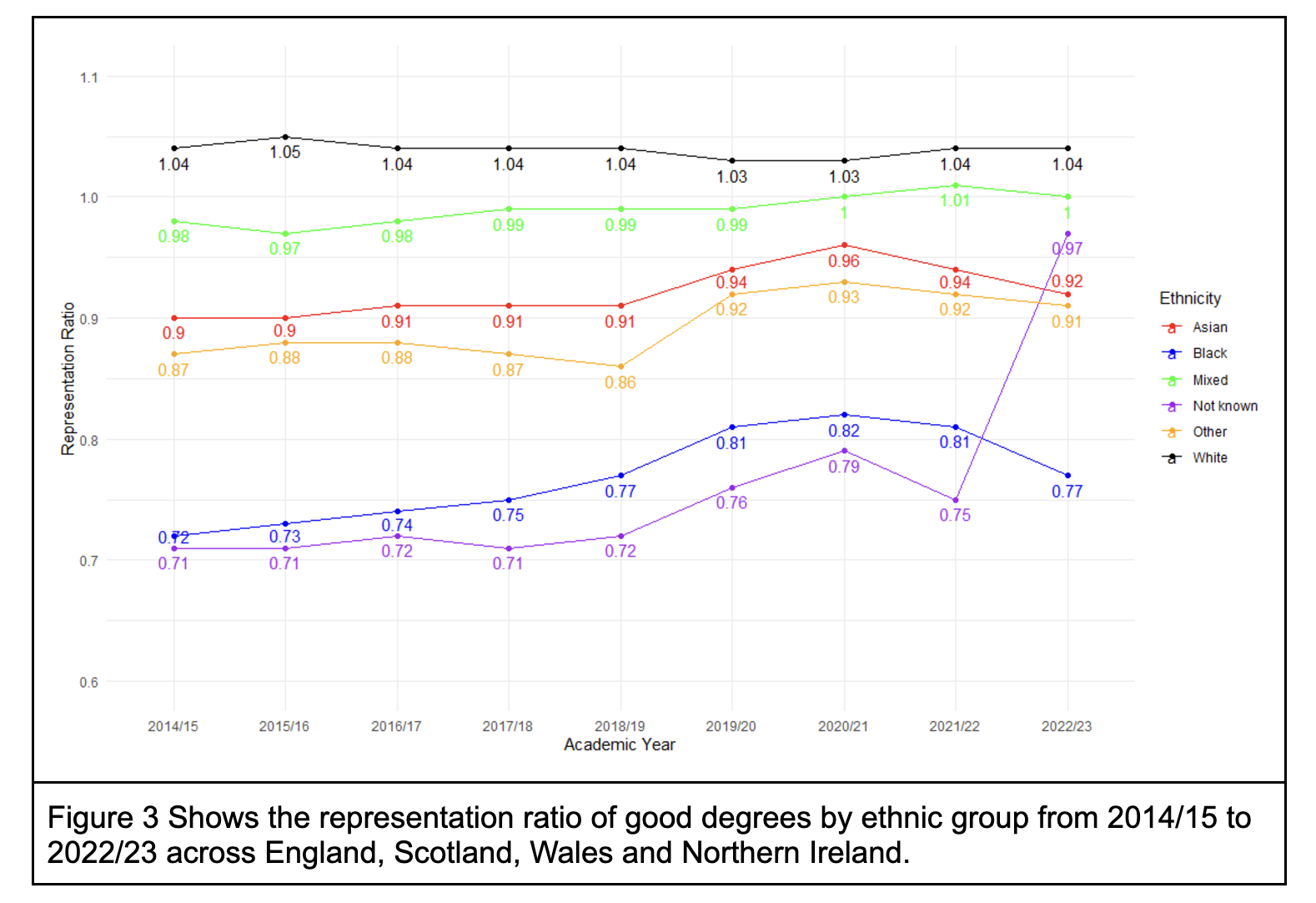 The use of representation ratio helps to put in perspective how many good degrees we should expect to see from any one group and might subtly change one’s conclusions and the actions one might wish to take.