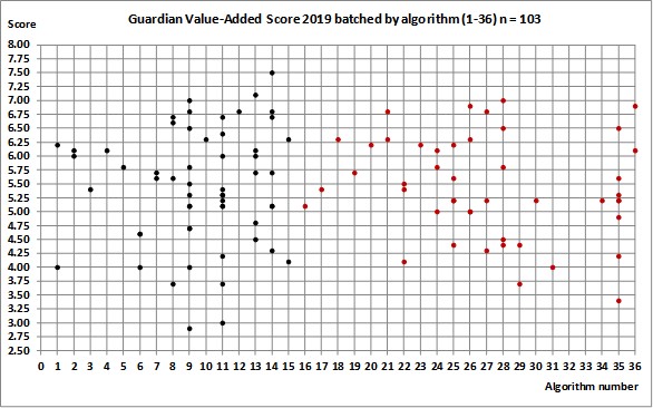 In the 2019 table, Sheffield (algorithm 11) and Nottingham Trent (algorithm 35) both have a value added score of 5.1, yet the algorithms are very different, such that we cannot reasonably make a comparisons between these two algorithms.