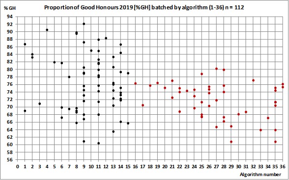 More generally, figure 1 suggests that discounting (algorithms 16 onwards) is perhaps concealing the true extent of student achievement (or lack thereof) in a large number of universities. However, this conclusion rests on the assumption that generally, the discounted marks are lower than the counting credits, and that year two marks are also lower than the final year marks.