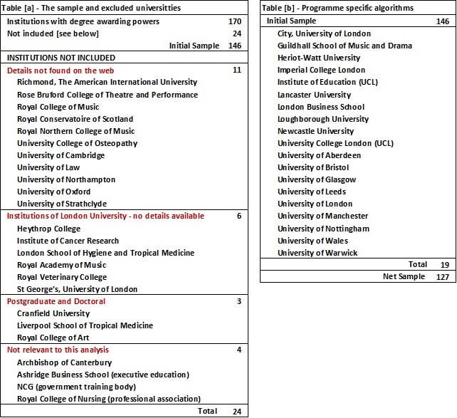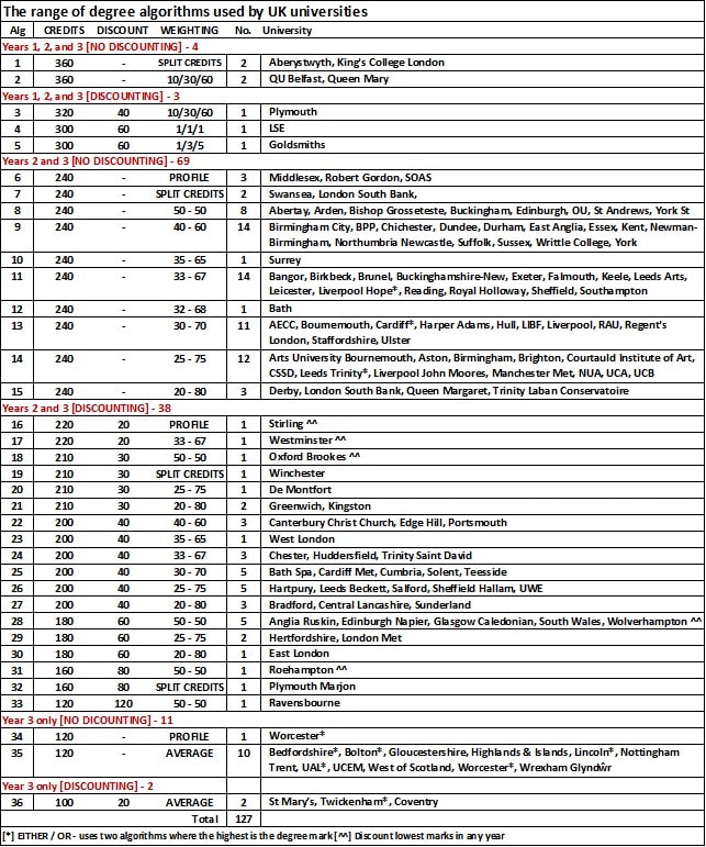 The full range of algorithms is shown in Table 2. Significantly, no university takes the straight average of all years. The closest to this overall average is the LSE algorithm, (algorithm 4) but which ignores 60 credits with the lowest marks in year 1.