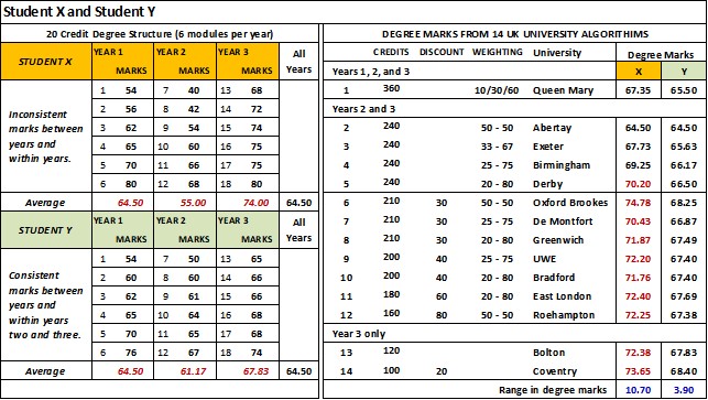 (a) The same set of marks would receive a different classification depending on which university the student attended (see Student X).