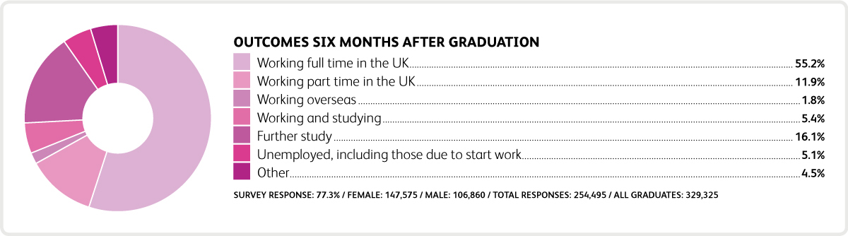 The majority of graduates were working after six months (74%) with unemployment standing at 5.1%, the lowest rate since the late 1970s. Of those in work after six months, 74% were in “professional level” employment, another relative high.