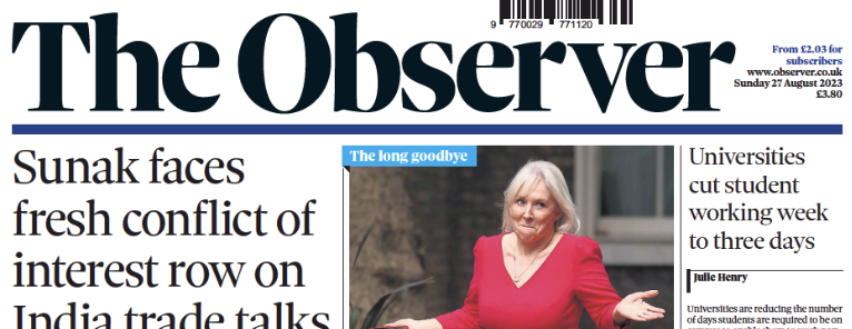 The Observer splashed with “UK universities offer three-day-week to let students find part-time work”, noting examples from DMU, Sunderland, Anglia Ruskin, University of Law and Coventry.