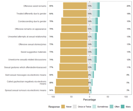55 per cent of respondents had experienced some form of sexual or gender harassment whilst studying at the university, with 35 per cent reporting at least one experience and 20 per cent experiencing it more than once or twice. Gender was a predictor of being targeted for harassment, with women and non-binary students being substantially more likely to have been targeted. Women and non-binary students were also more likely than men to have experienced sexual harassment more frequently.