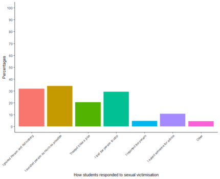The university uses the ‘Report and Support’ system for reporting any form of harassment or bullying behaviours. This system allows anonymous reports and access support and links for making a formal report. Figure 2 shows the most common ways that students handled incidents of sexual harassment were to avoid that person in the future (34 per cent), ignore the person and doing nothing (31 per cent) and telling the person to stop (29 per cent). Only 5 per cent of those subjected to sexual or gender-based harassment indicated that they had reported this in some way. Low reporting rates have been found to be normal across wider studies of sexual harassment, but this rate of reporting is lower than some other studies have found.