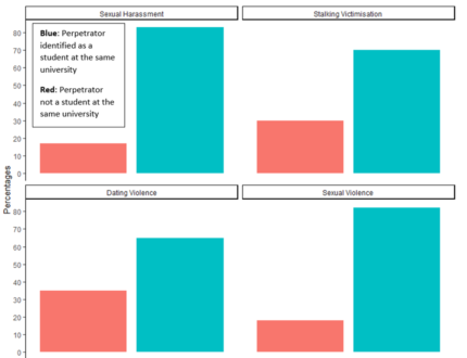 Figure 4: Percentage of perpetrators of different behaviours who were described as students at the same university across the four different types of gender-based violence/harassment.