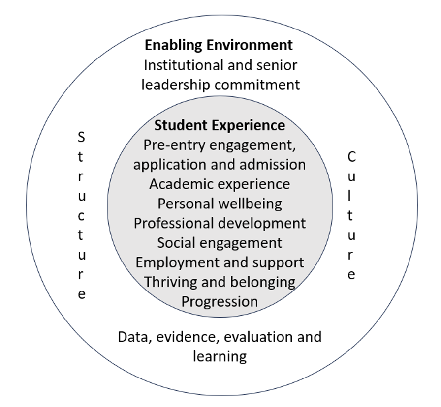 - Institutional policies and processes (structure) aligned to support widening access and student success, and the coordination of work across the higher education provider.
