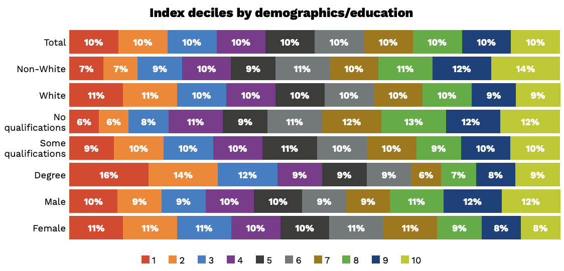 One helpful set of clues as to what’s going on can be found in a fairly overlooked piece of polling carried out for Hope not Hate late last year. On the social attitudes stuff, it polled on four issues – identity, politics, multiculturalism and conspiracy – with some of the starkest differences being about the level of qualification attained: