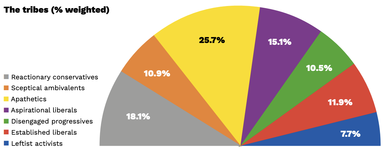 - Established liberals and leftist activists (about 12 and 8 per cent respectively) – hold very strong progressive values, although the former embrace the political system whereas the latter reject mainstream politics and don’t trust the government.