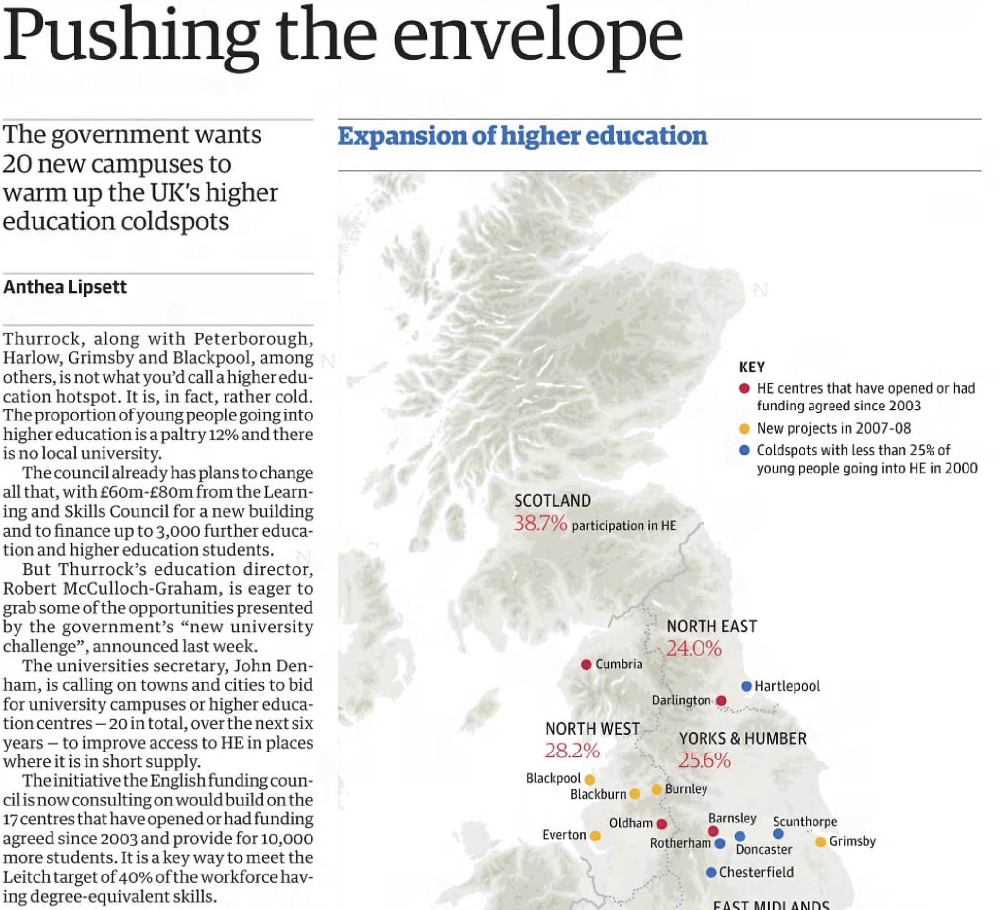 The current Labour government’s Post-16 education and skills white paper makes familiar noises about addressing “cold spots in under-served regions.” But there’s no money for new campuses, no Strategic Development Fund, no New University Challenge. Instead, there’s a working group. And around the edges, we’re watching the geographical distribution of higher education shrink.