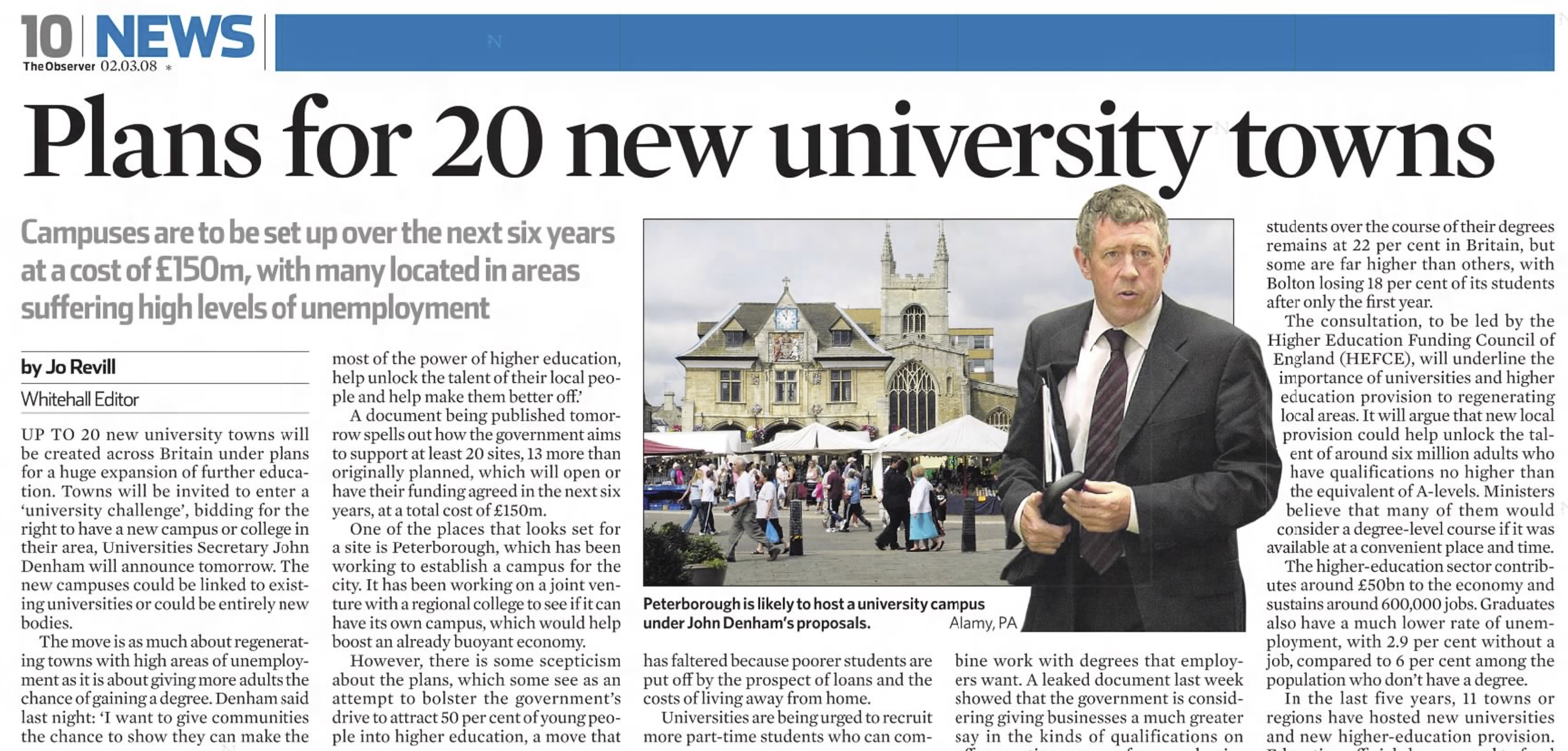 There were plenty more. In “A New University Challenge,” Denham reminded readers that, since 2003, capital funding and additional student numbers had already gone into eleven areas – Barnsley, Cornwall, Cumbria, Darlington, Folkestone, Hastings, Medway, Oldham, Peterborough, Southend and Suffolk – with HEFCE agreeing support for six more – Blackburn, Blackpool, Burnley, Everton, Grimsby, and North and South Devon.